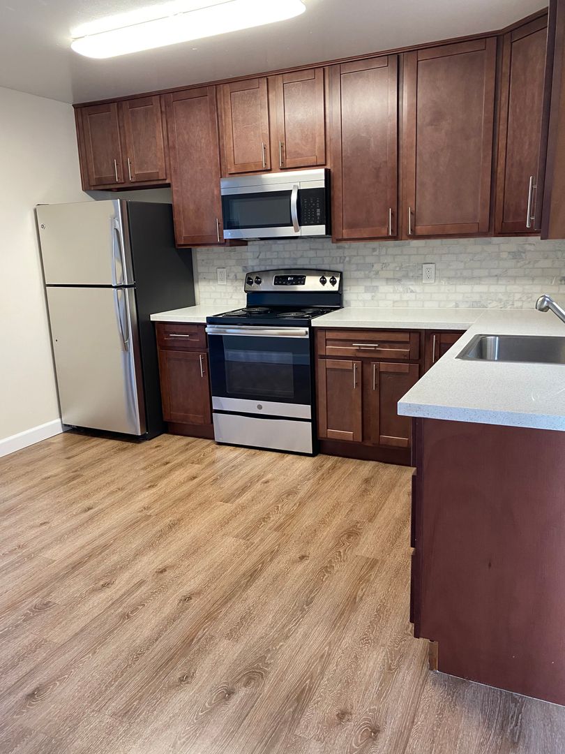 This unit features a spacious family room that flows into a beautiful eat-in kitchen with newer countertops and appliances, quality cabinets, warm paint colors and new flooring throughout the unit. A spacious master bedroom and second bedroom boast large windows with lots of light, ceiling fans, brand new carpet and tons of closet space. The bathroom has new fixtures and a sliding glass shower door.